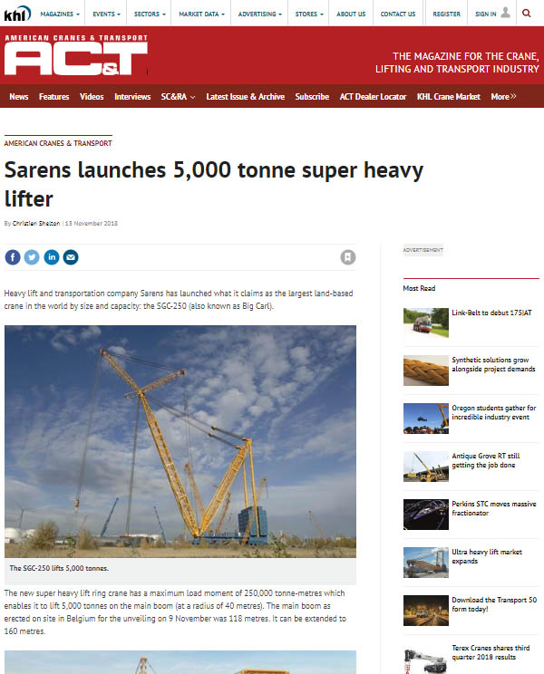Sarens SGC Series Cranes Featured on the Cover Page of the American Crane and Transport Magazine as well as a Feature Article