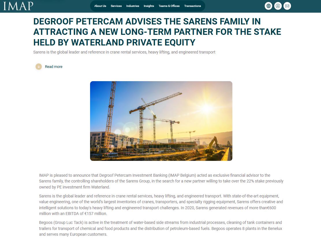 Degroof Petercam advises the Sarens family in attracting a new long-term partner for the stake held by Waterland Private Equity